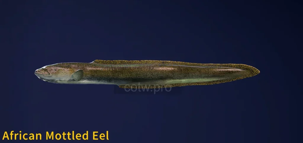 Minnow (100%), Redworm (100%), Wafters - White (100%), Eggs (38%), Frog - Twitching (38%), Grub - Jigging (38%), Grub - Twitching (38%), Jerkbait - Constant (38%), Jerkbait - Stop and Go (38%), Jerkbait - Twitching (38%), Leeches (38%), Liver (38%), Pellets - Regular (38%), Shad - Constant (38%), Shad - Jigging (38%), Shad - Stop and Go (38%), Shad - Twitching (38%), Swimbait - Constant (38%), Swimbait - Stop and Go (38%), Swimbait - Twitching (38%), Worm - Jigging (38%), Artificial Corn - Yellow (13%), Bloodworm (13%), Grub - Constant (13%), Hotdog (13%), Imitation Dog Biscuits (13%), Spinnerbait - Constant (13%), Spinnerbait - Stop and Go (13%), Spinnerbait - Twitching (13%), Tube - Jigging (13%) and Tube - Twitching (13%) can be used to lure and catch African Mottled Eel in COTW the Angler. The percentages indicate the preference level for a specific bait or lure, where 100% is most prefered.